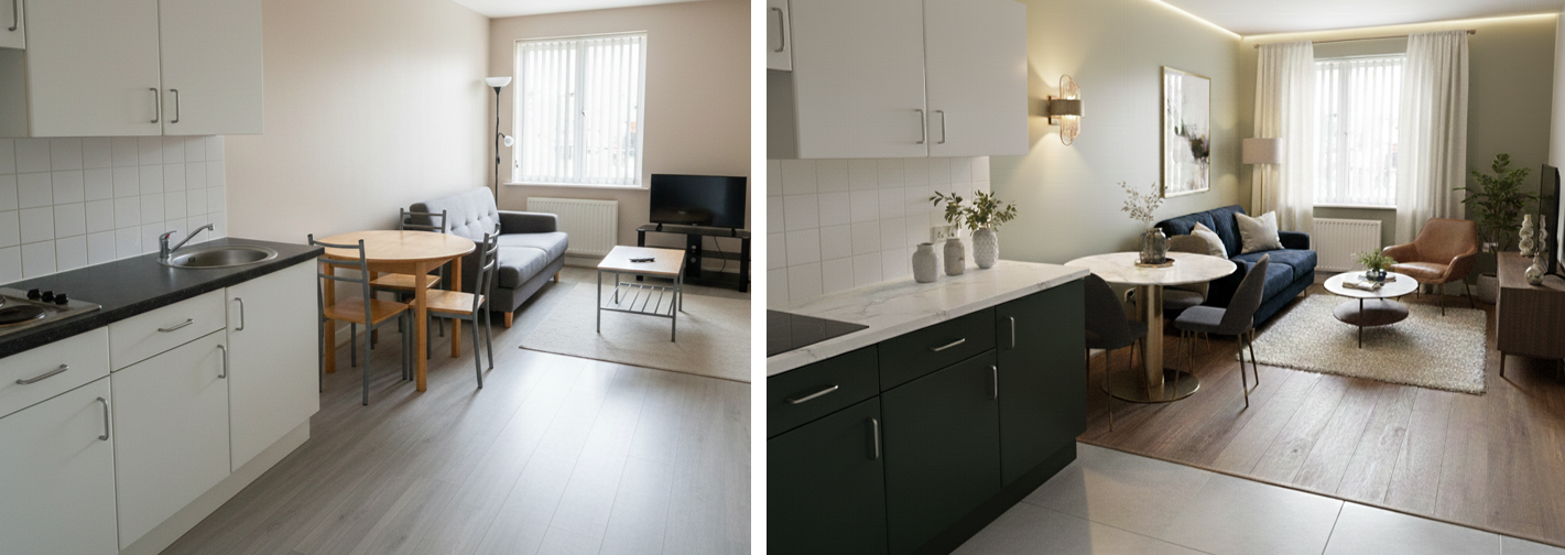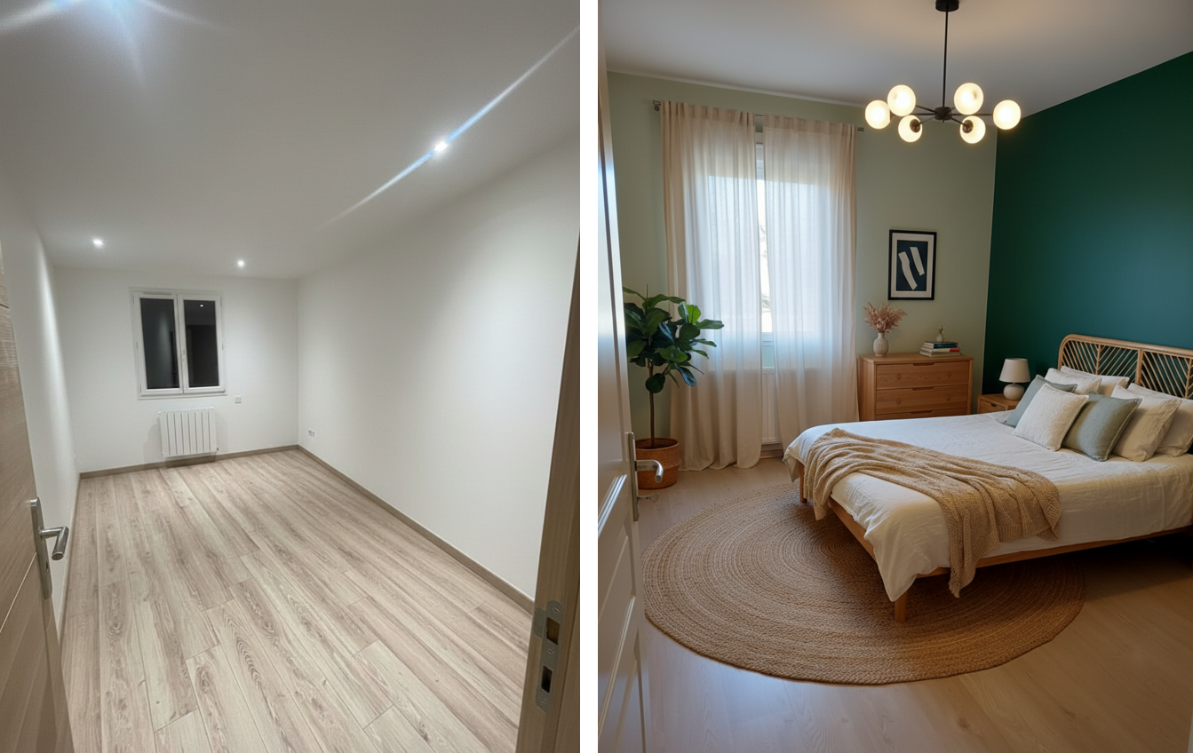 L’ajout d’une plante verte haute près de la fenêtre et d’un luminaire design à boules blanches transforme radicalement l’aspect “chantier” du départ en un espace de vie sophistiqué et accueillant.